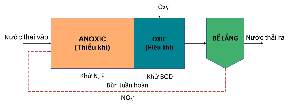 Bể hiếu khí (Oxic): Xảy ra quá trình phân hủy chất hữu cơ và oxy hóa nitơ.